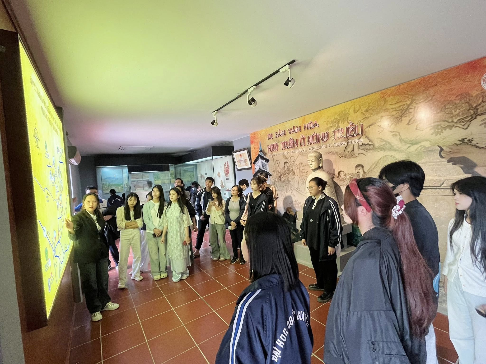 Học sinh tham quan tại Nhà trưng bày hiện vật thuộc khu di tích Đền An Sinh