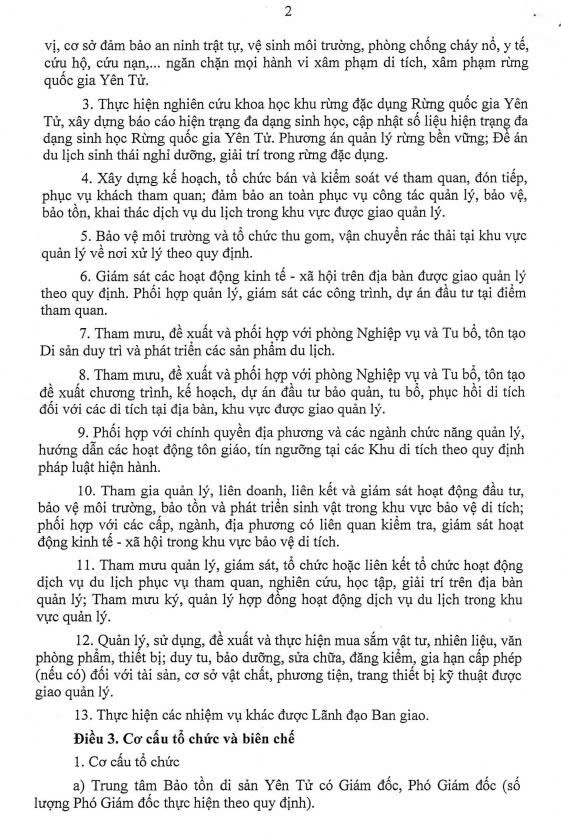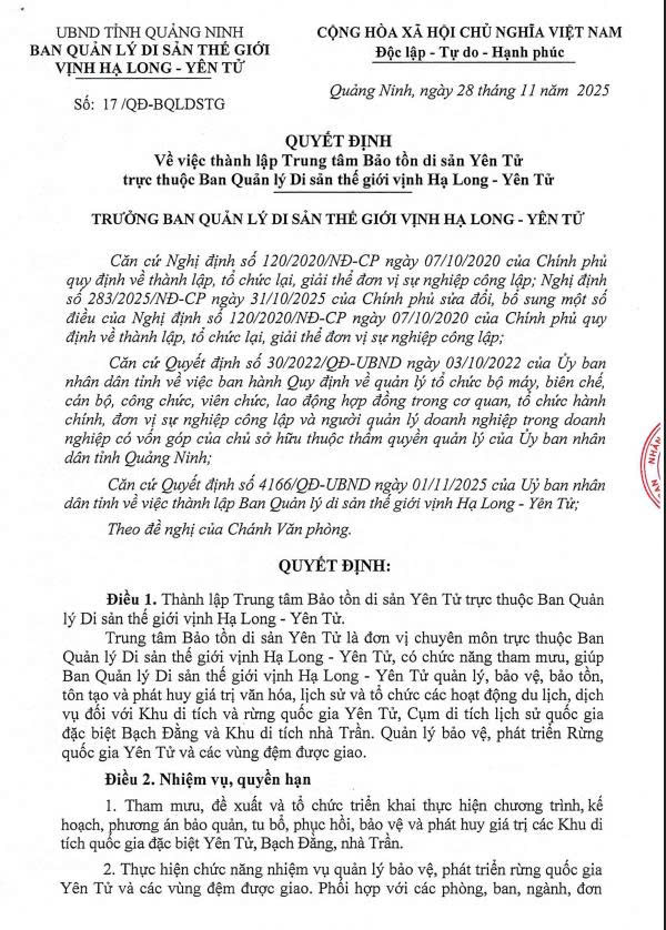 Trung tâm bảo tồn di sản Yên Tử trực thuộc Ban quản lý di sản thế giới vịnh Long - Yên Tử được thành lập theo Quyết định số 17/QĐ-BQLDSTG ngày 28/112025 của Ban quản lý di sản thế giới vịnh Hạ Long - Yên Tử.